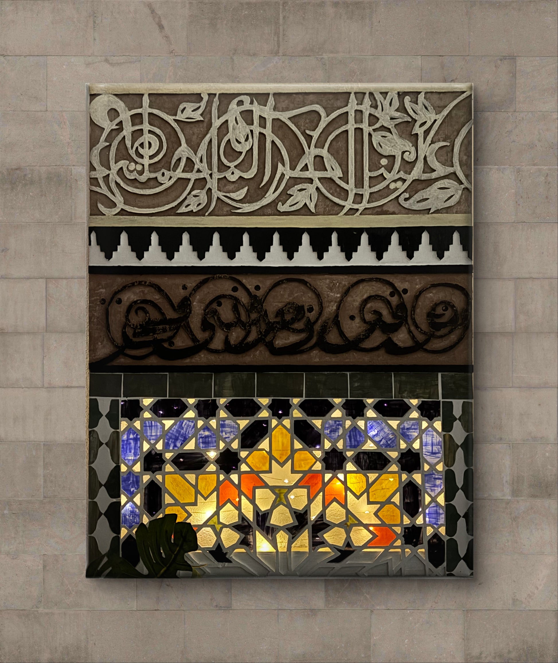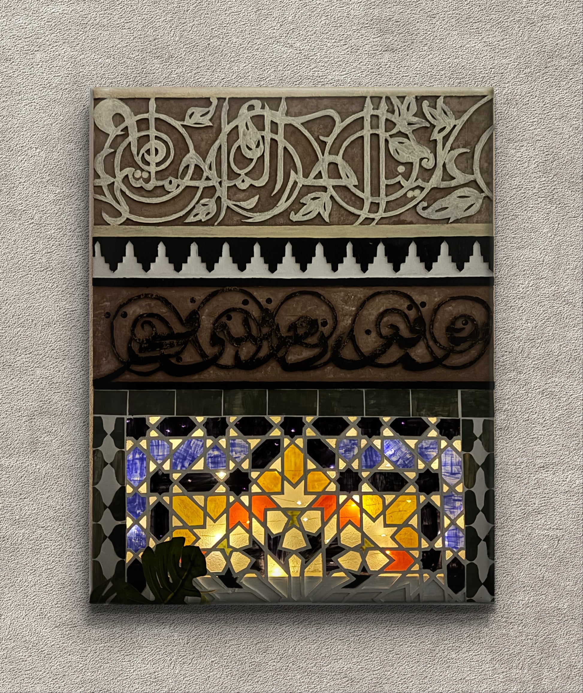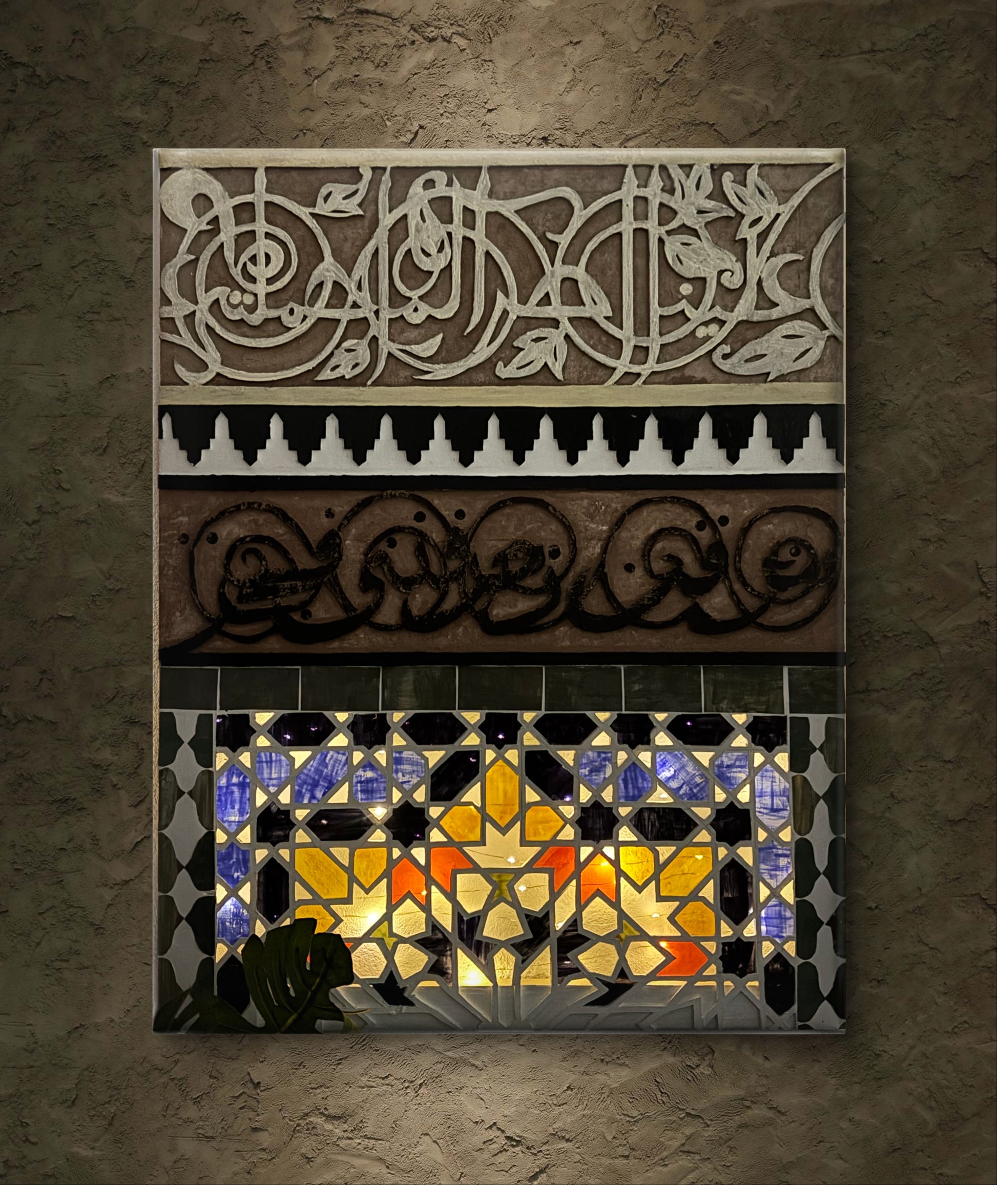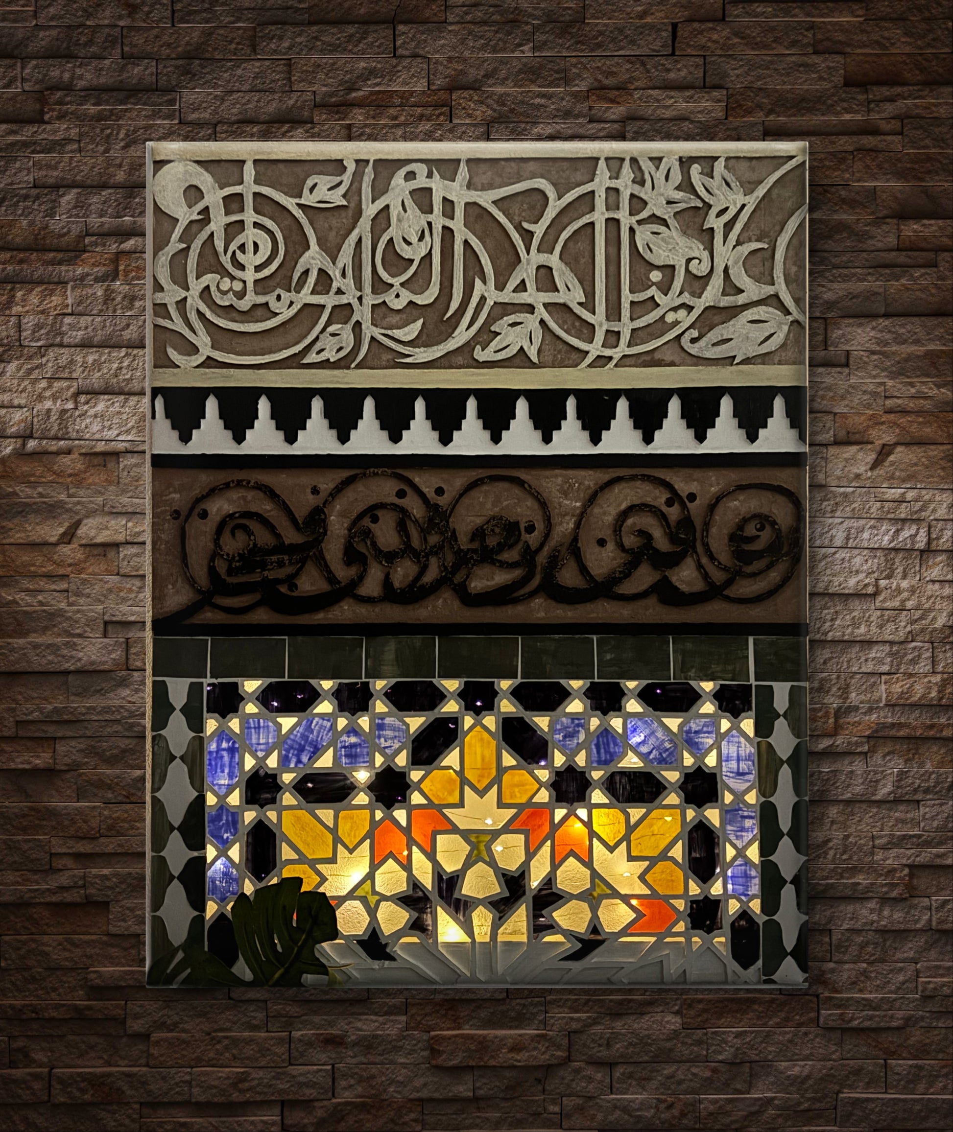 الإضاءة المدمجة داخل العمل تضيف بُعدًا روحيًا وبصريًا، وتحوّل الجدار إلى نافذة نور وتاريخ، كأنك أمام أثر معماري خالد.