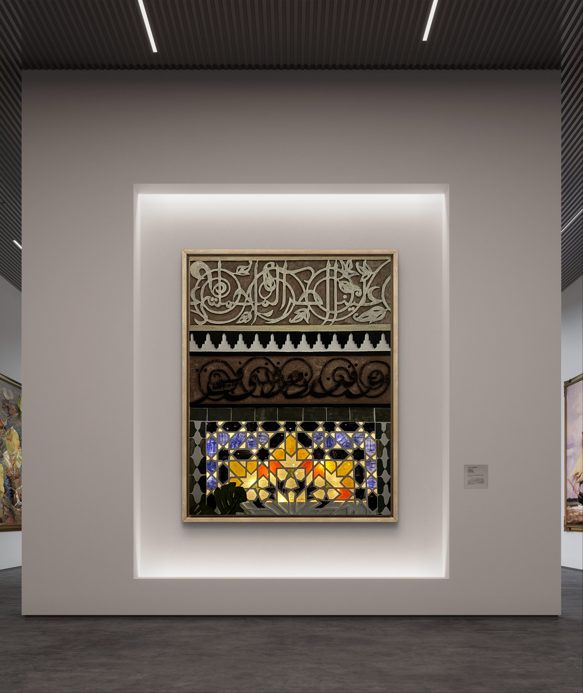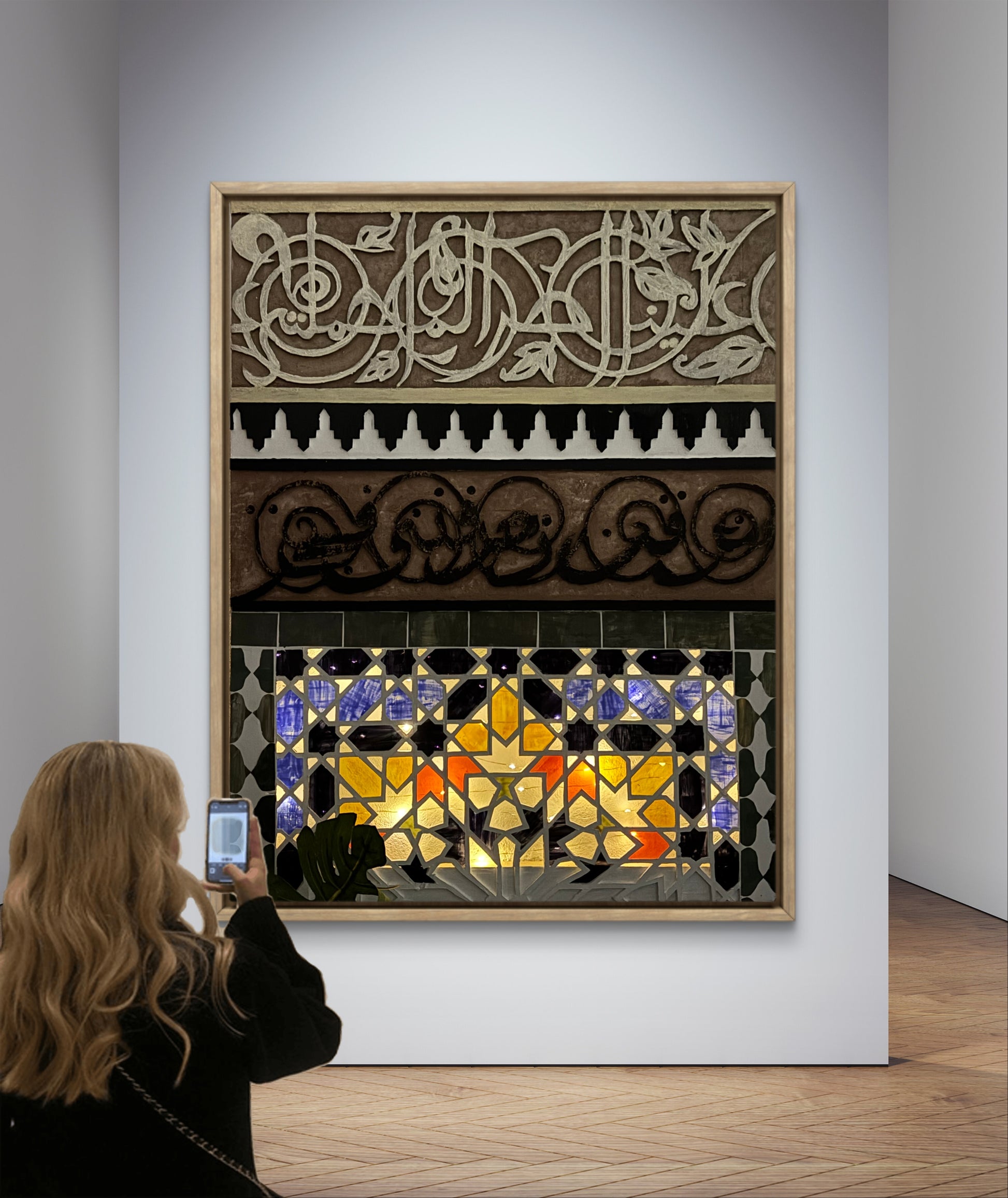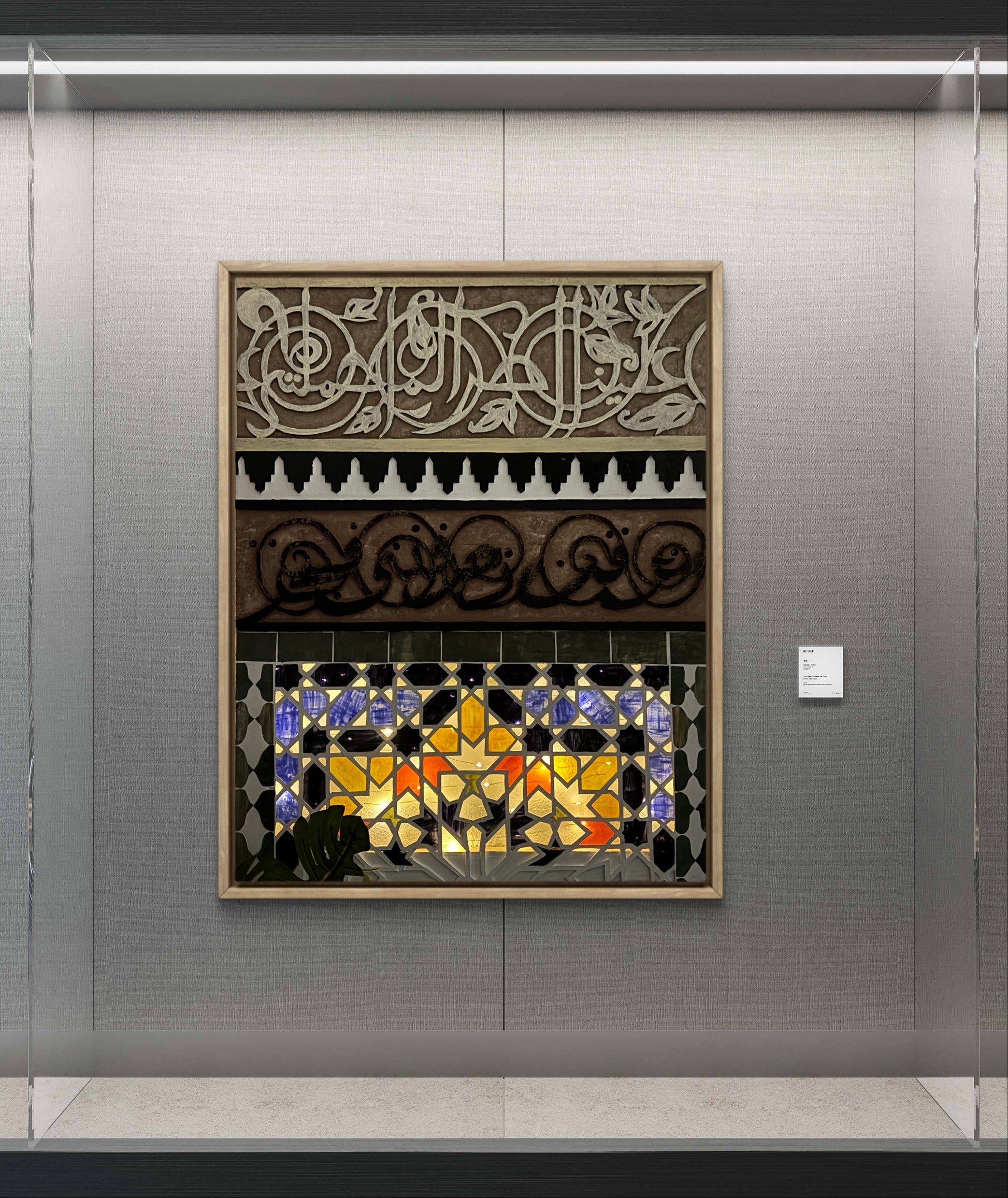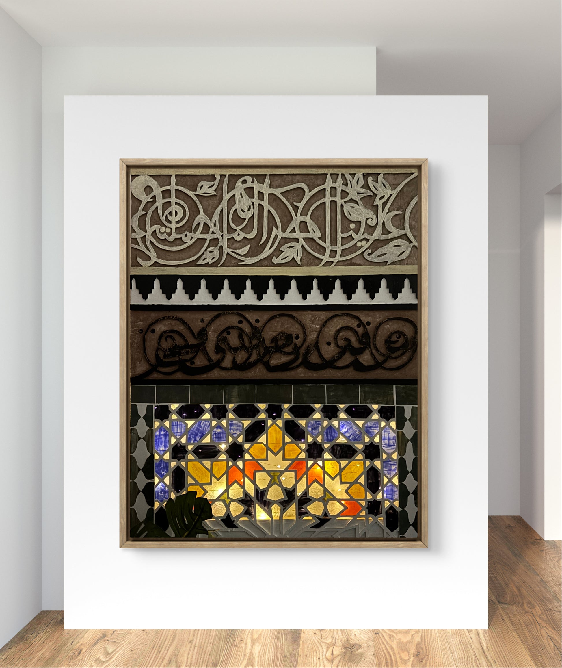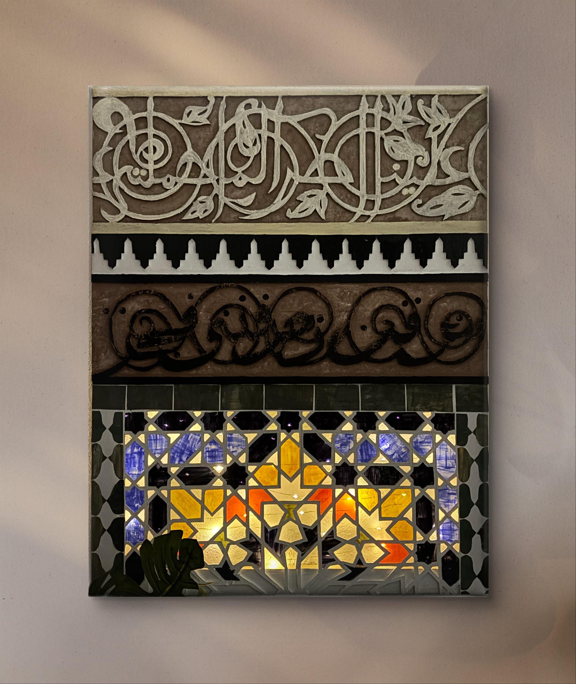 الإضاءة المدمجة داخل العمل تضيف بُعدًا روحيًا وبصريًا، وتحوّل الجدار إلى نافذة نور وتاريخ، كأنك أمام أثر معماري خالد.