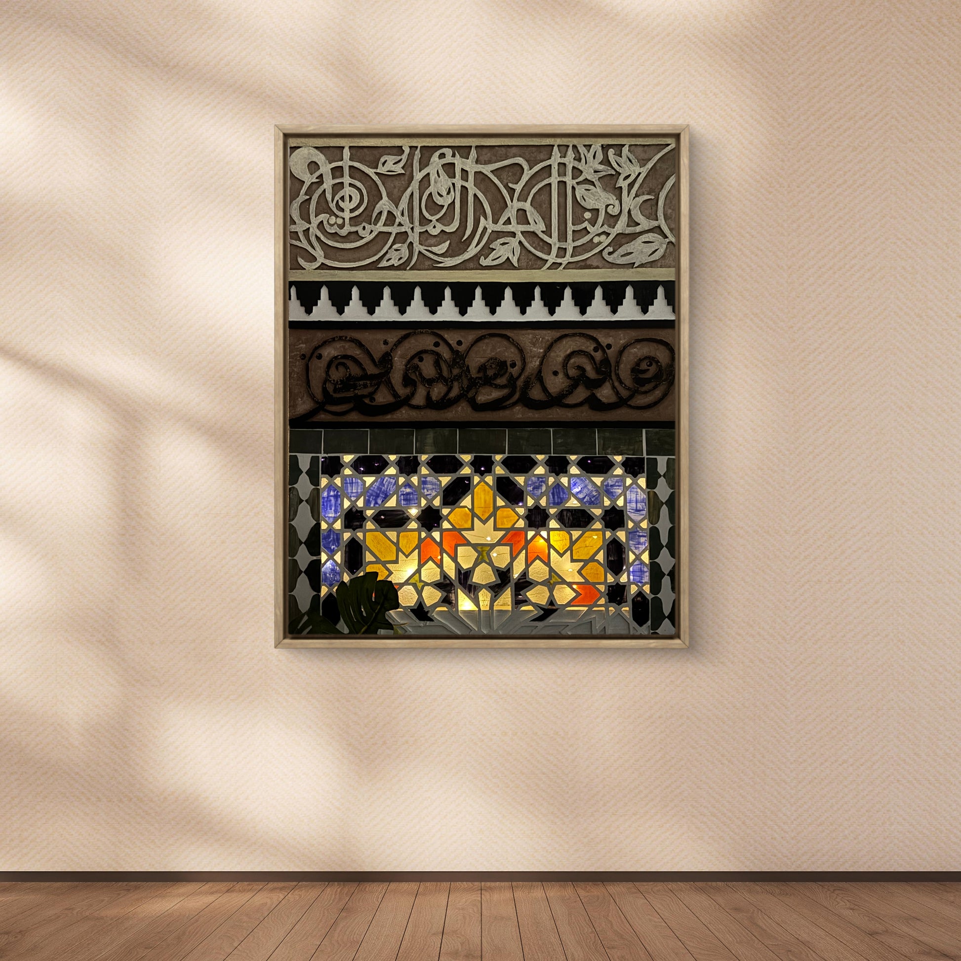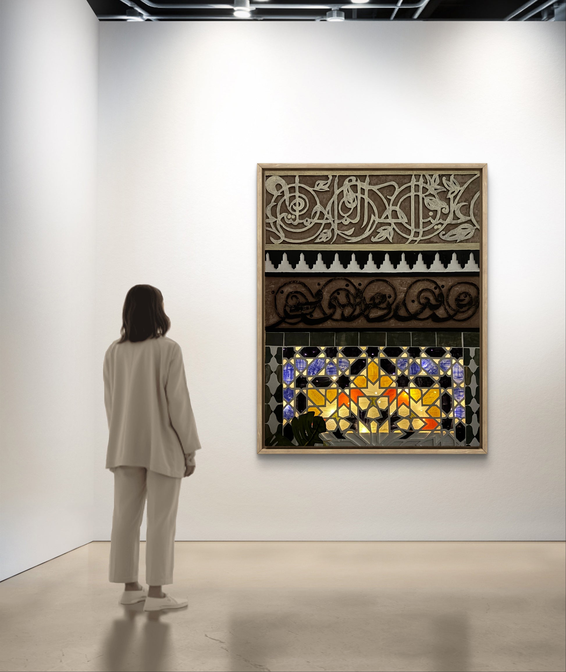 لوحة فنية مصنوعة يدويًا بتفاصيل ثلاثية الأبعاد، تحتفي بجمال الزخرفة المغربية الإسلامية وتُجسد مفهوم "الخلود" البصري من خلال تداخل الحرف العربي، النحت، الزليج، والإضاءة.