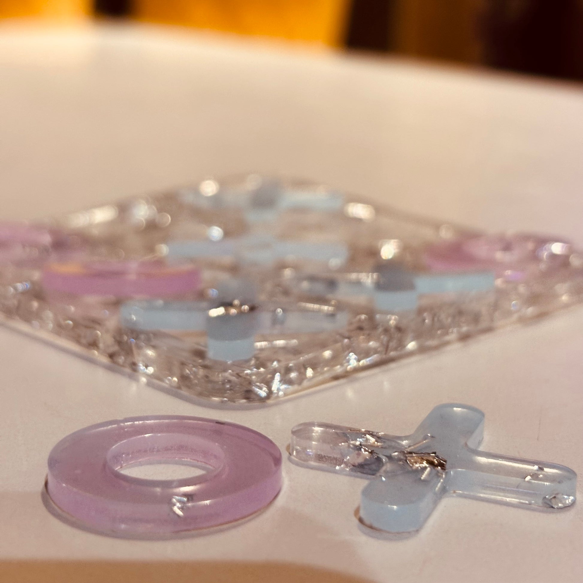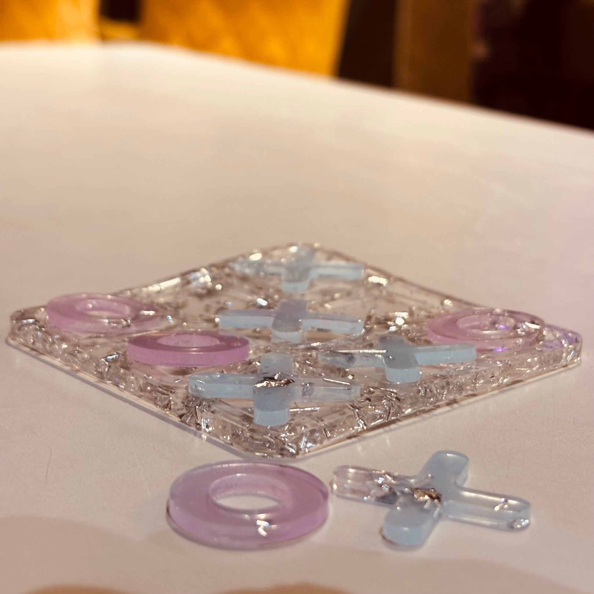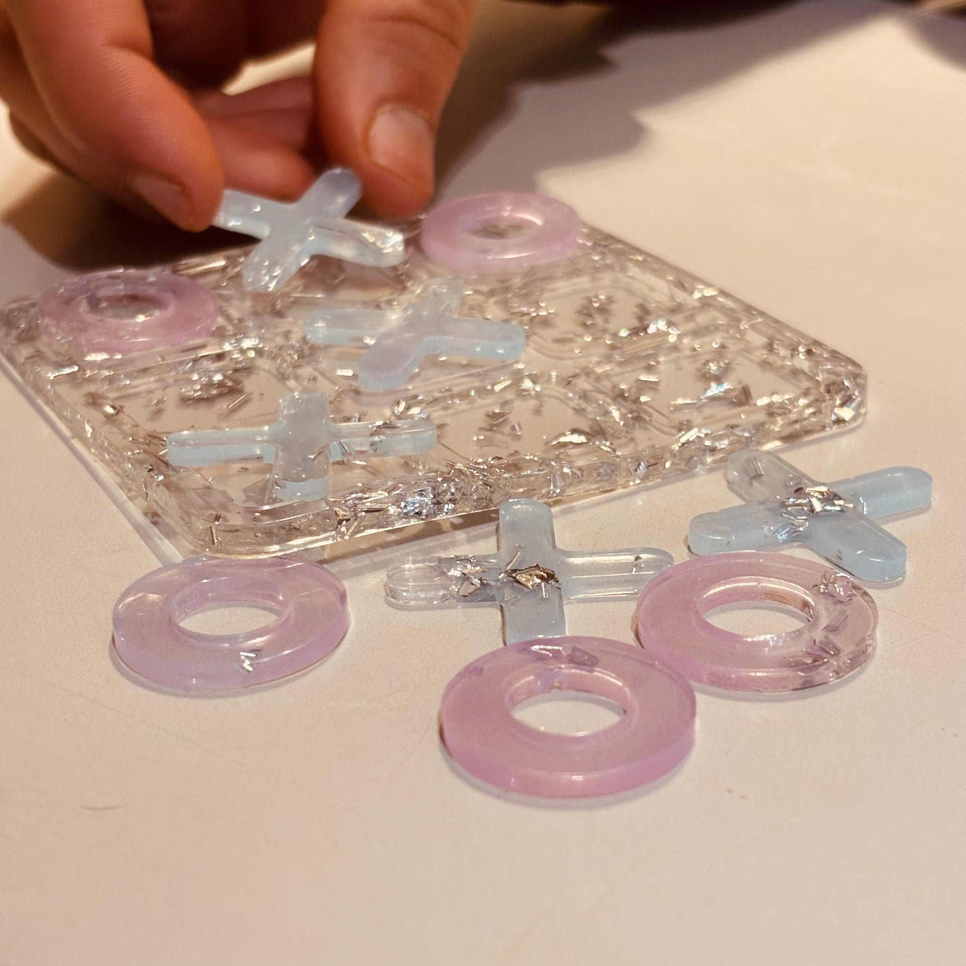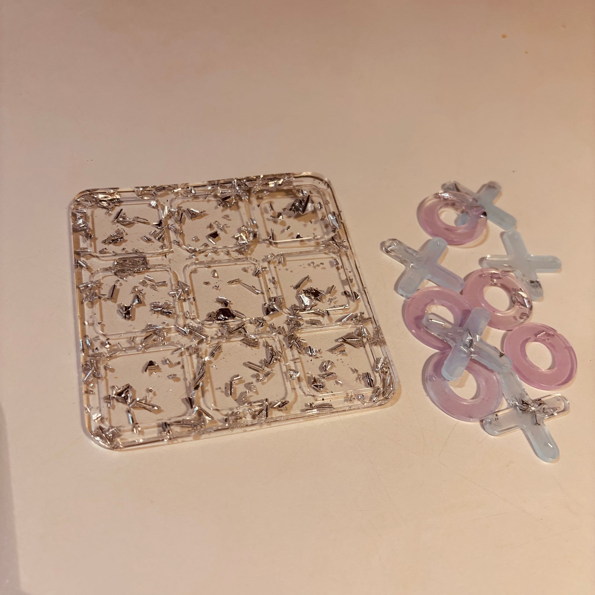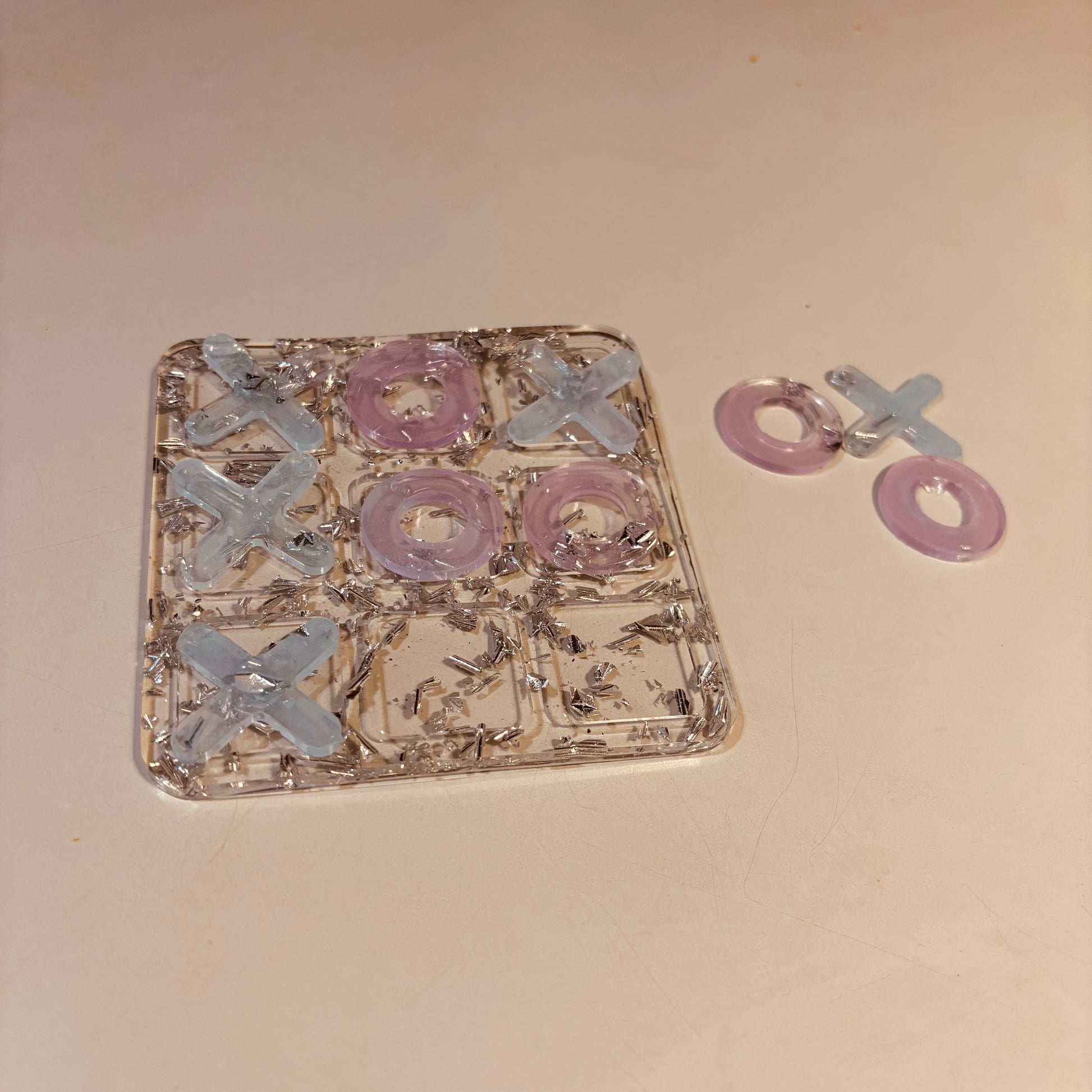 "لعبة تيك تاك تو مصنوعة يدويًا من الرايزين الإيبوكسي الفاخر، تتميز بتصميم شفاف يحتوي على قطع فضية براقة تضيف لمسة من الأناقة. تأتي القطع الملونة بألوان هادئة من الأزرق والوردي، مما يجعلها مثالية للزينة أو اللعب الممتع مع الأصدقاء والعائلة. هذه اللعبة ليست مجرد وسيلة للتسلية، بل أيضًا قطعة فنية فريدة تضيف جمالًا إلى أي مكان توضع فيه. مثالية كهدية مميزة أو لإضافة لمسة إبداعية إلى منزلك!"