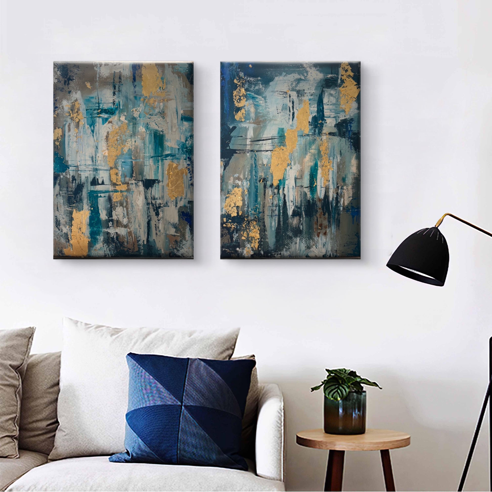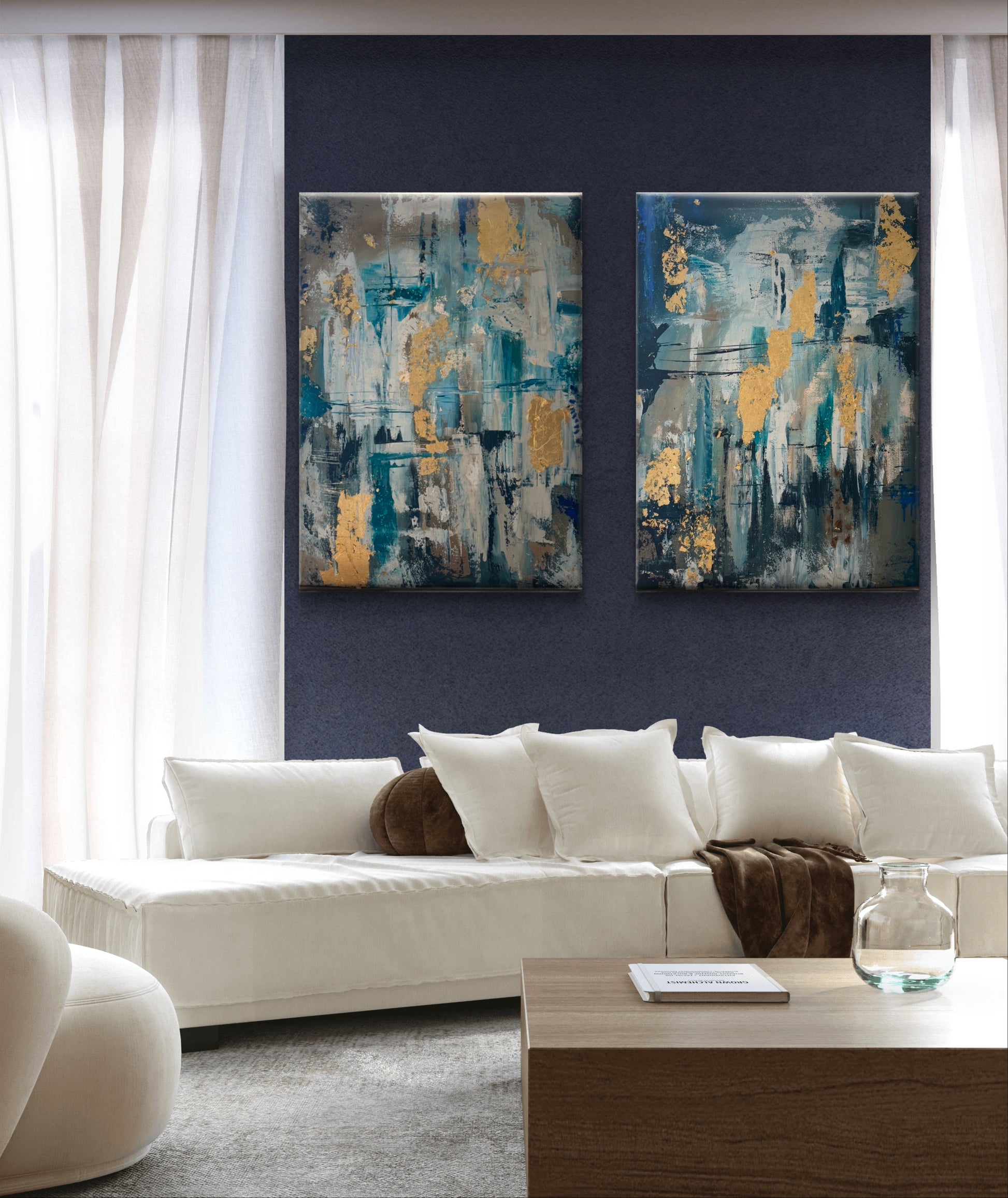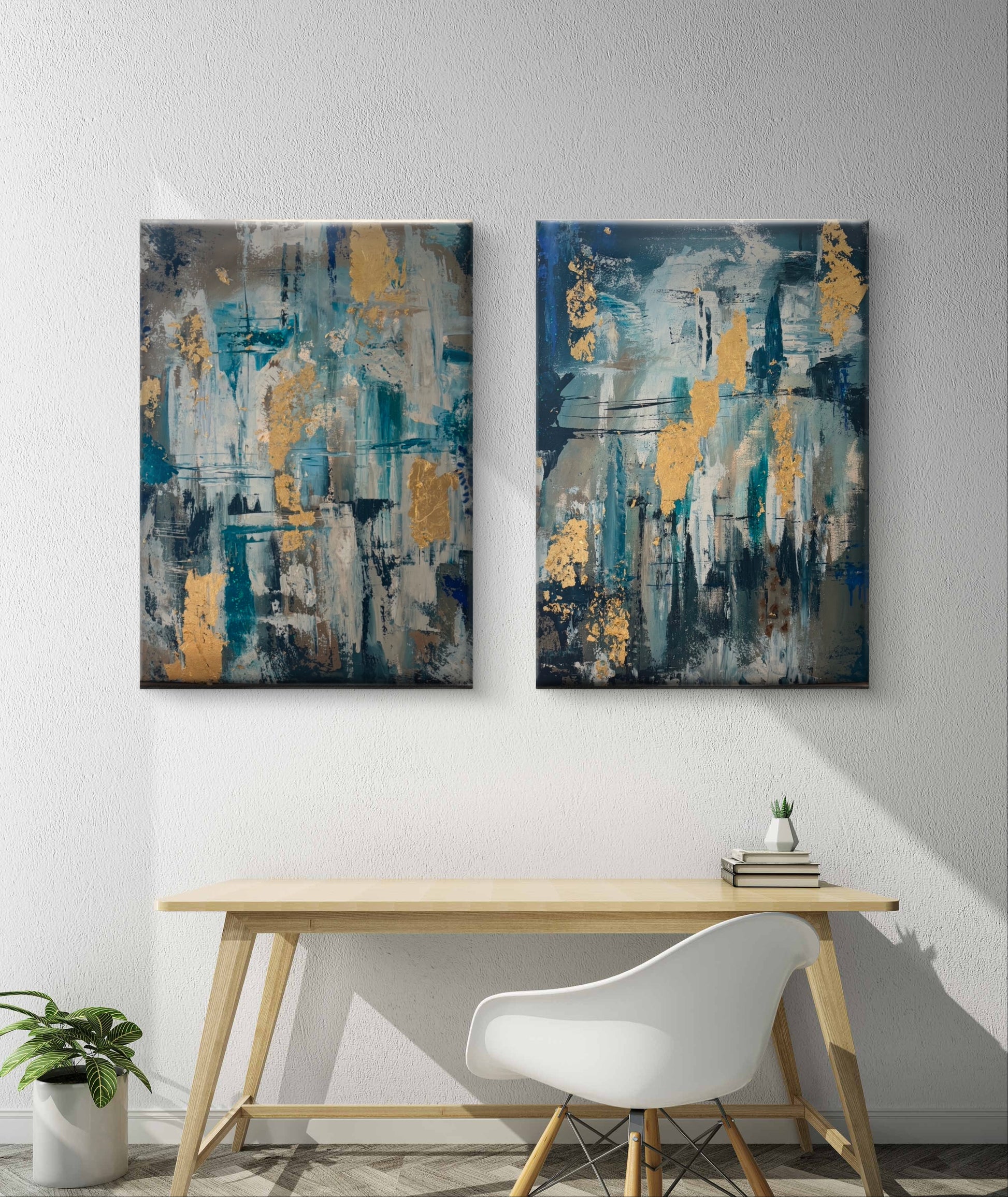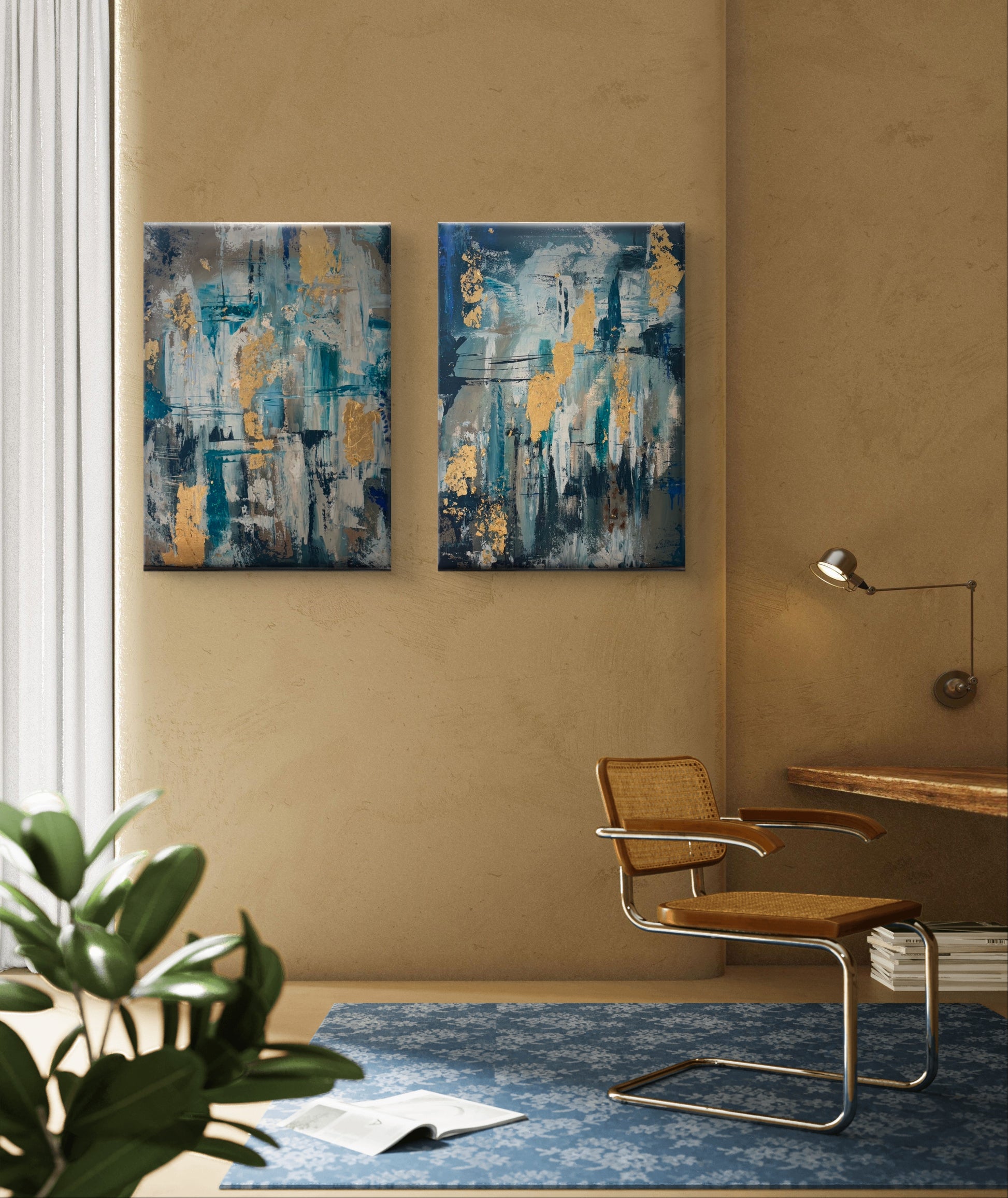 اكتشفوا روعة التعبير الفني المعاصر من خلال هذه المجموعة الفريدة المكوّنة من لوحتين متكاملتين، صُمّمتا ليكونتا معاً قطعة محورية في أي مساحة راقية. تجمع هذه الأعمال بين درجات الأزرق، الرمادي، والتركواز بانسجام بصري ساحر، وتتخللها لمسات من ورق الذهب التي تعكس الضوء وتضفي إحساساً بالفخامة والرقي.