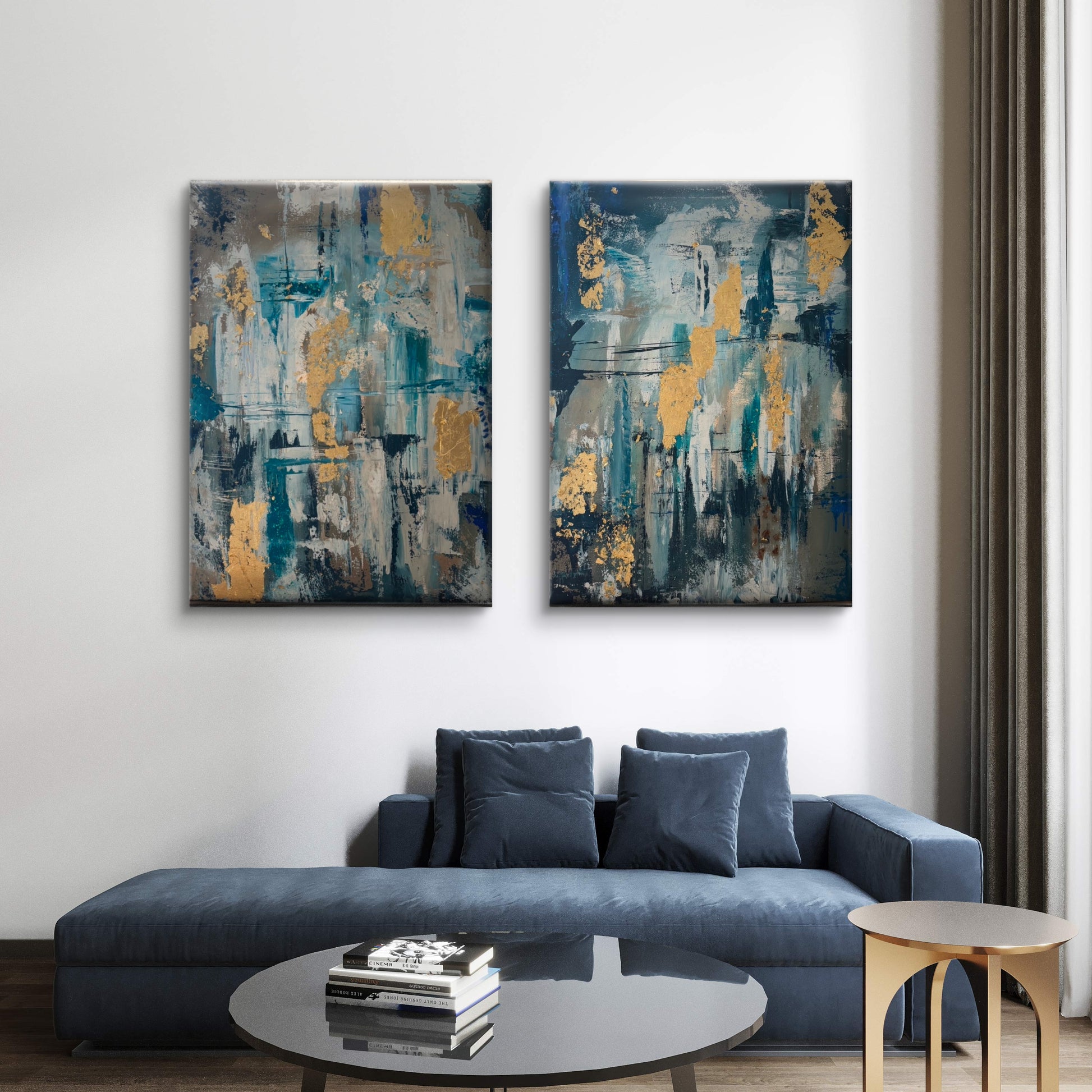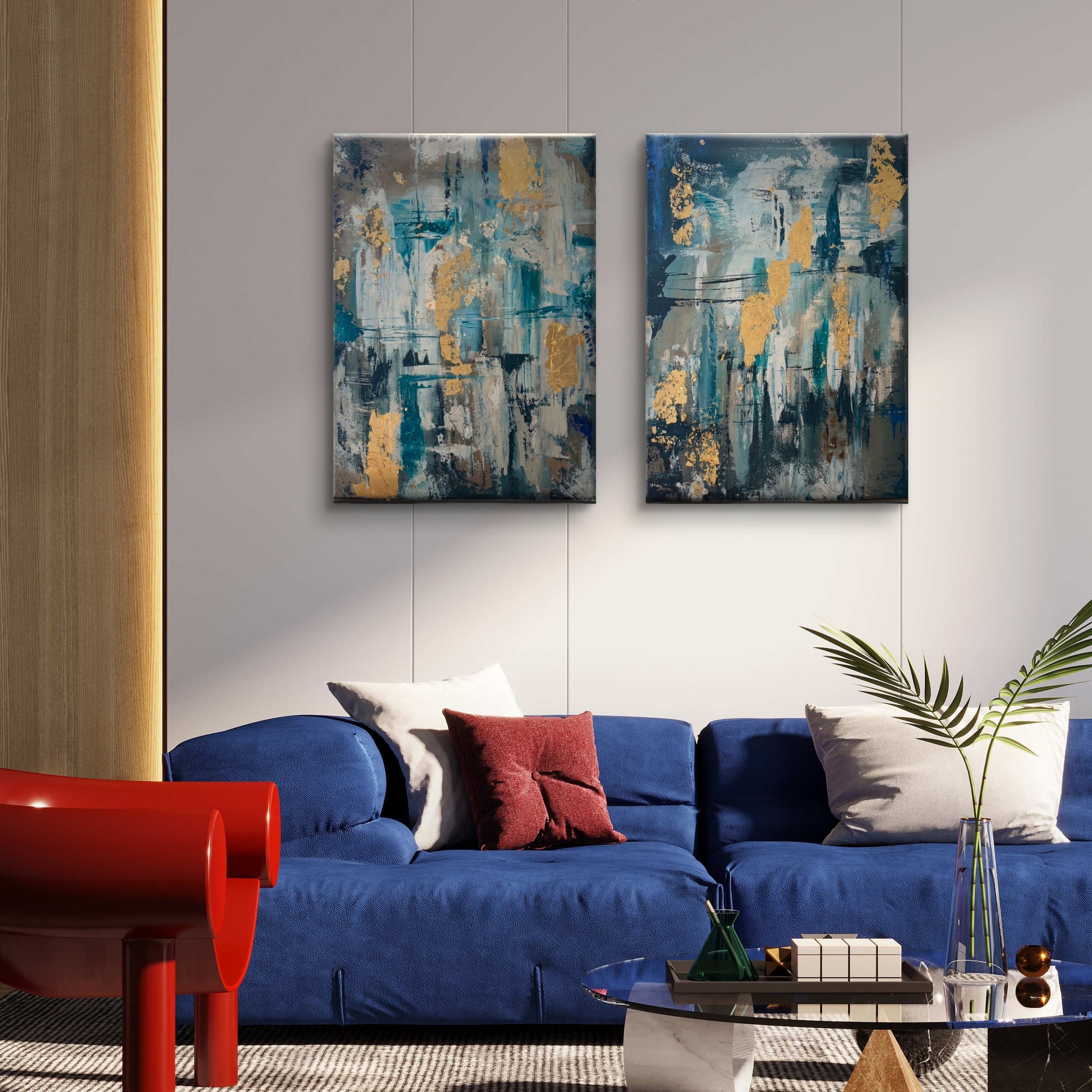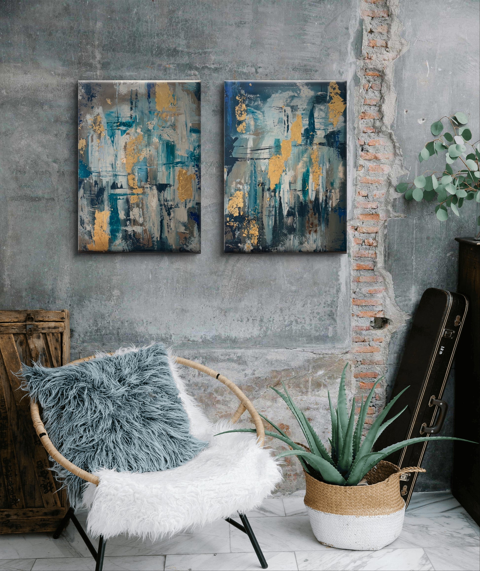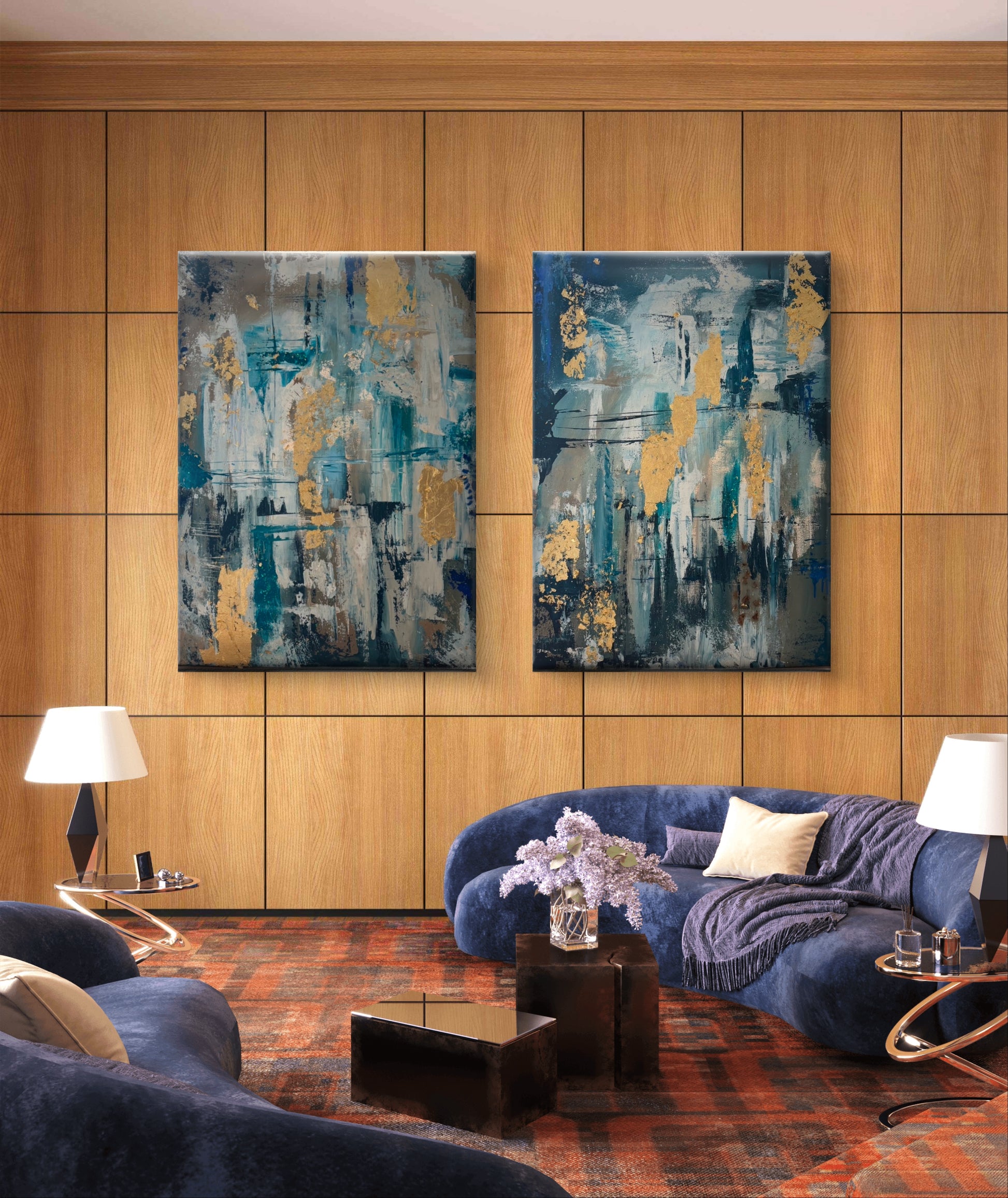 اكتشفوا روعة التعبير الفني المعاصر من خلال هذه المجموعة الفريدة المكوّنة من لوحتين متكاملتين، صُمّمتا ليكونتا معاً قطعة محورية في أي مساحة راقية. تجمع هذه الأعمال بين درجات الأزرق، الرمادي، والتركواز بانسجام بصري ساحر، وتتخللها لمسات من ورق الذهب التي تعكس الضوء وتضفي إحساساً بالفخامة والرقي.