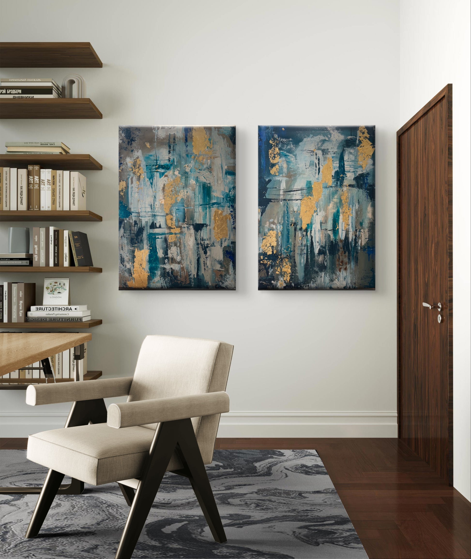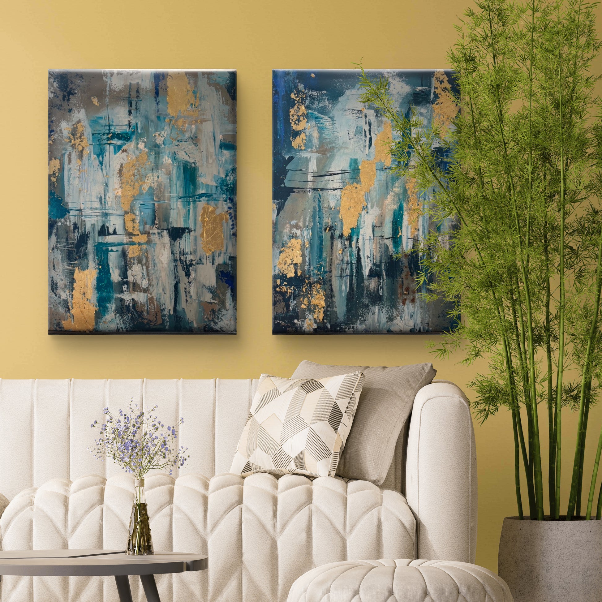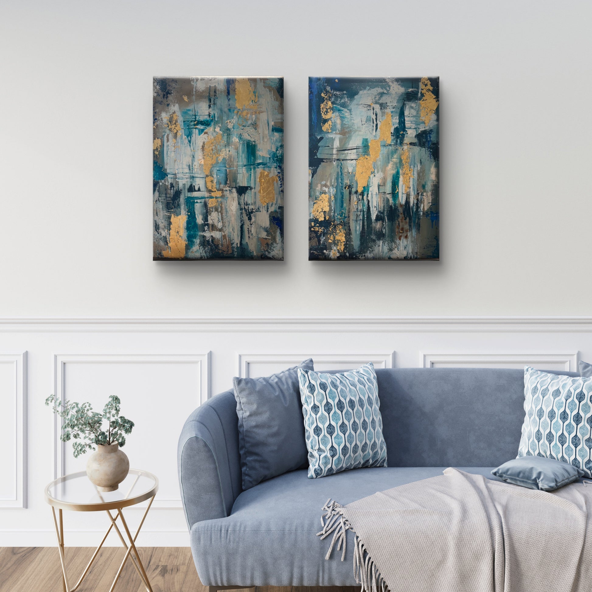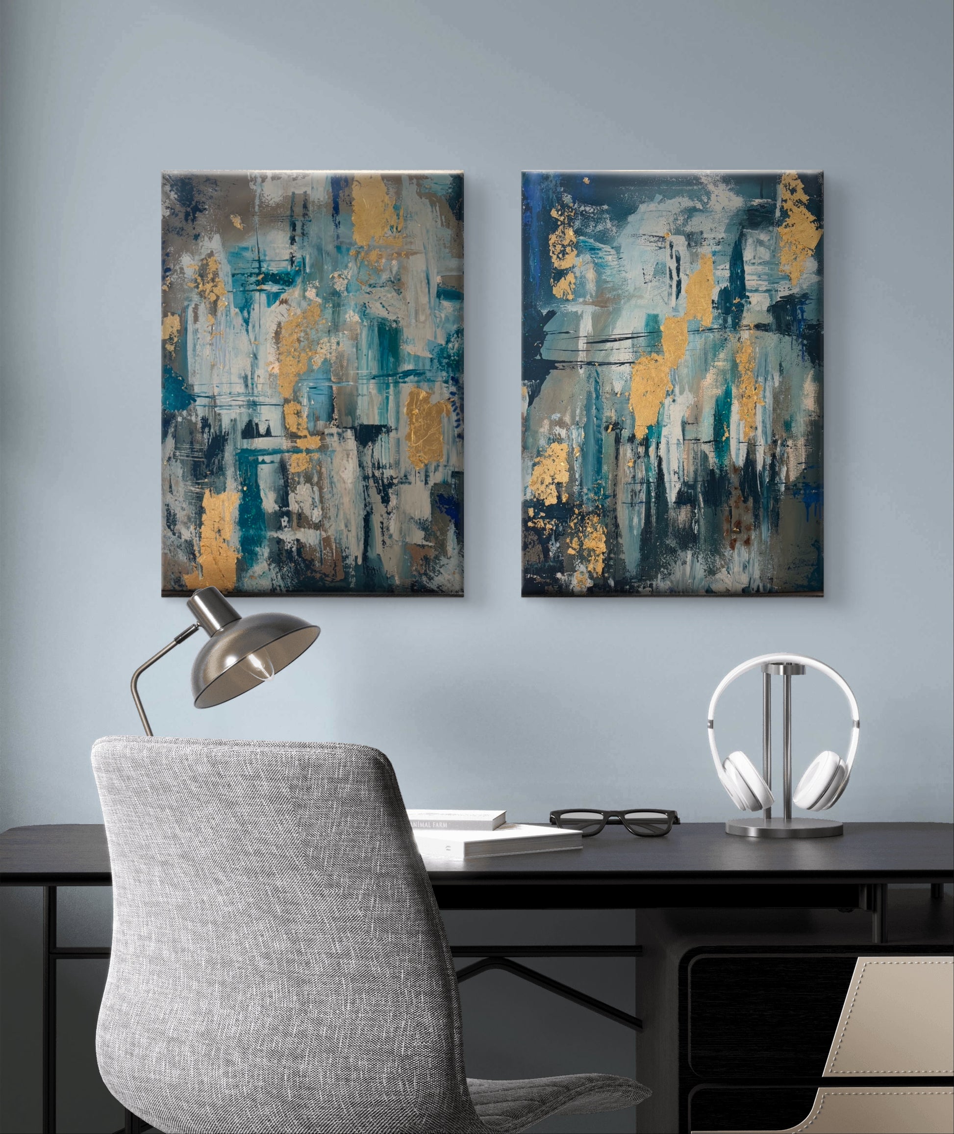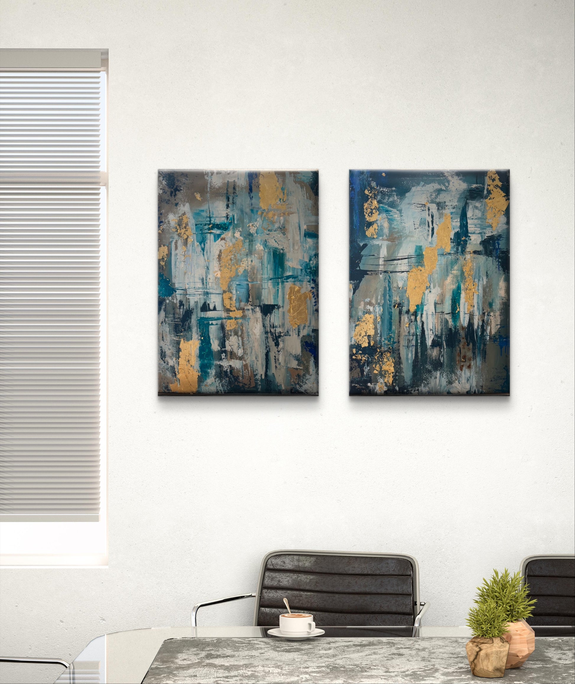 اكتشفوا روعة التعبير الفني المعاصر من خلال هذه المجموعة الفريدة المكوّنة من لوحتين متكاملتين، صُمّمتا ليكونتا معاً قطعة محورية في أي مساحة راقية. تجمع هذه الأعمال بين درجات الأزرق، الرمادي، والتركواز بانسجام بصري ساحر، وتتخللها لمسات من ورق الذهب التي تعكس الضوء وتضفي إحساساً بالفخامة والرقي.