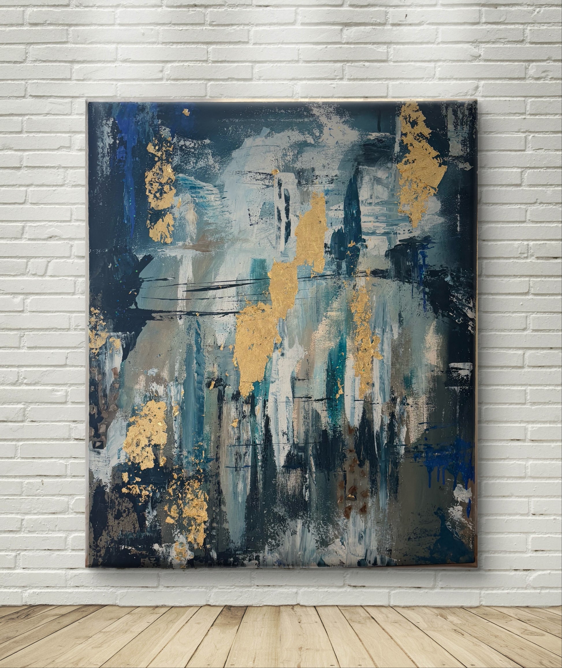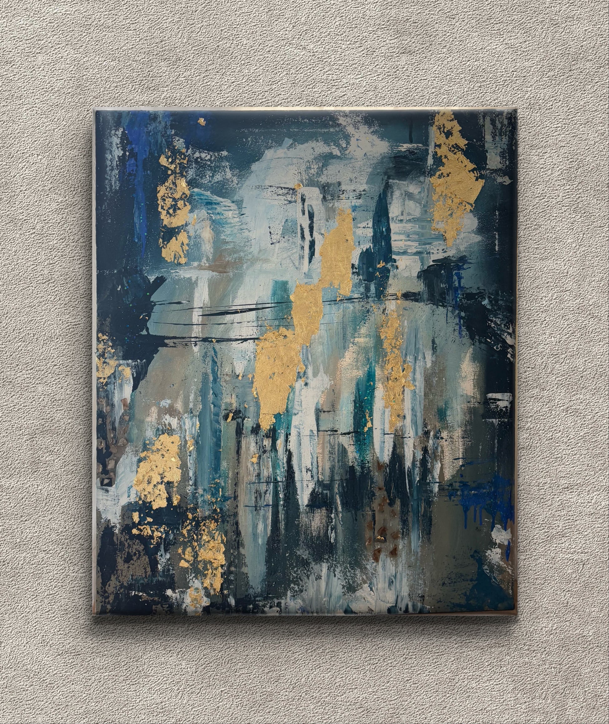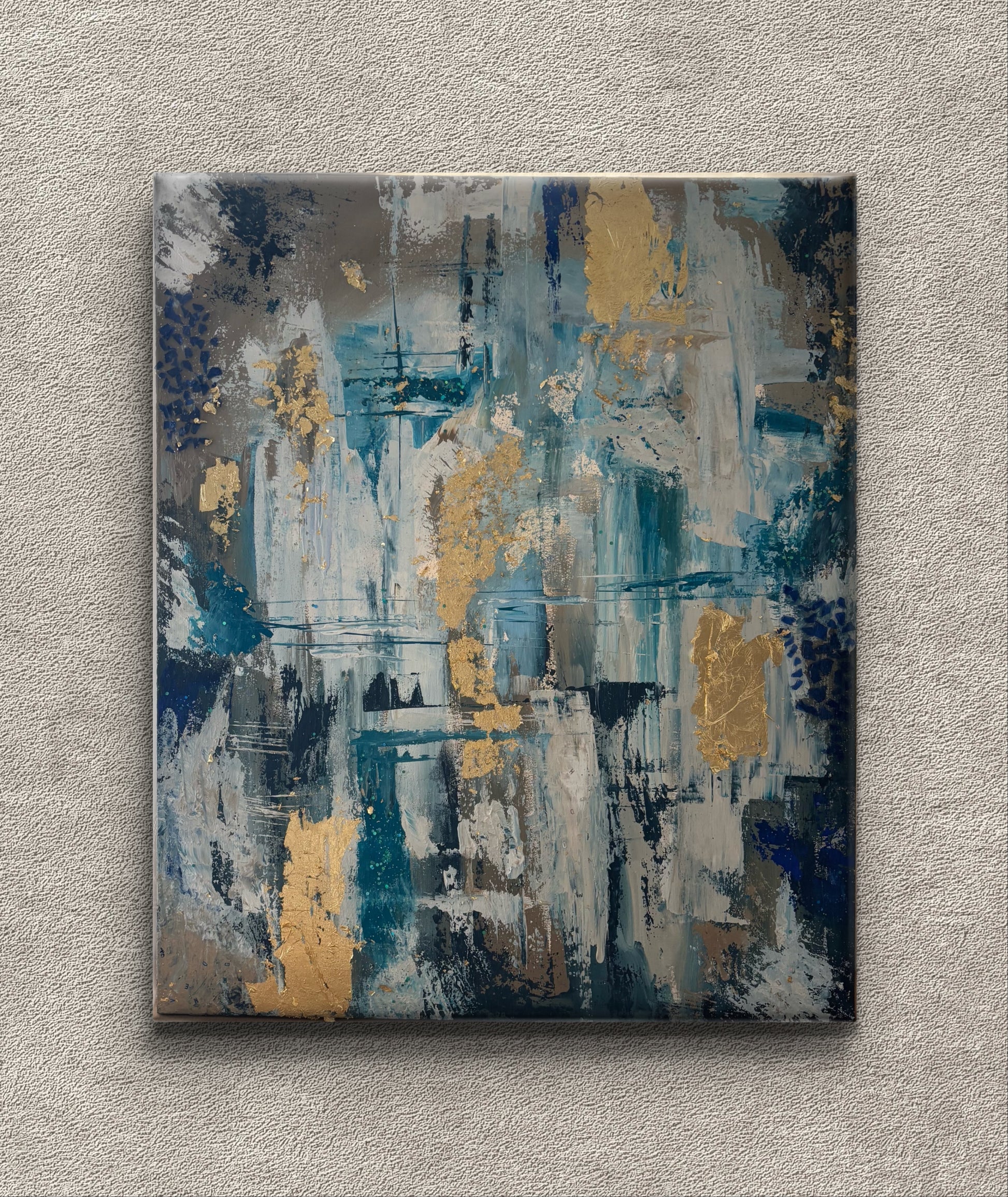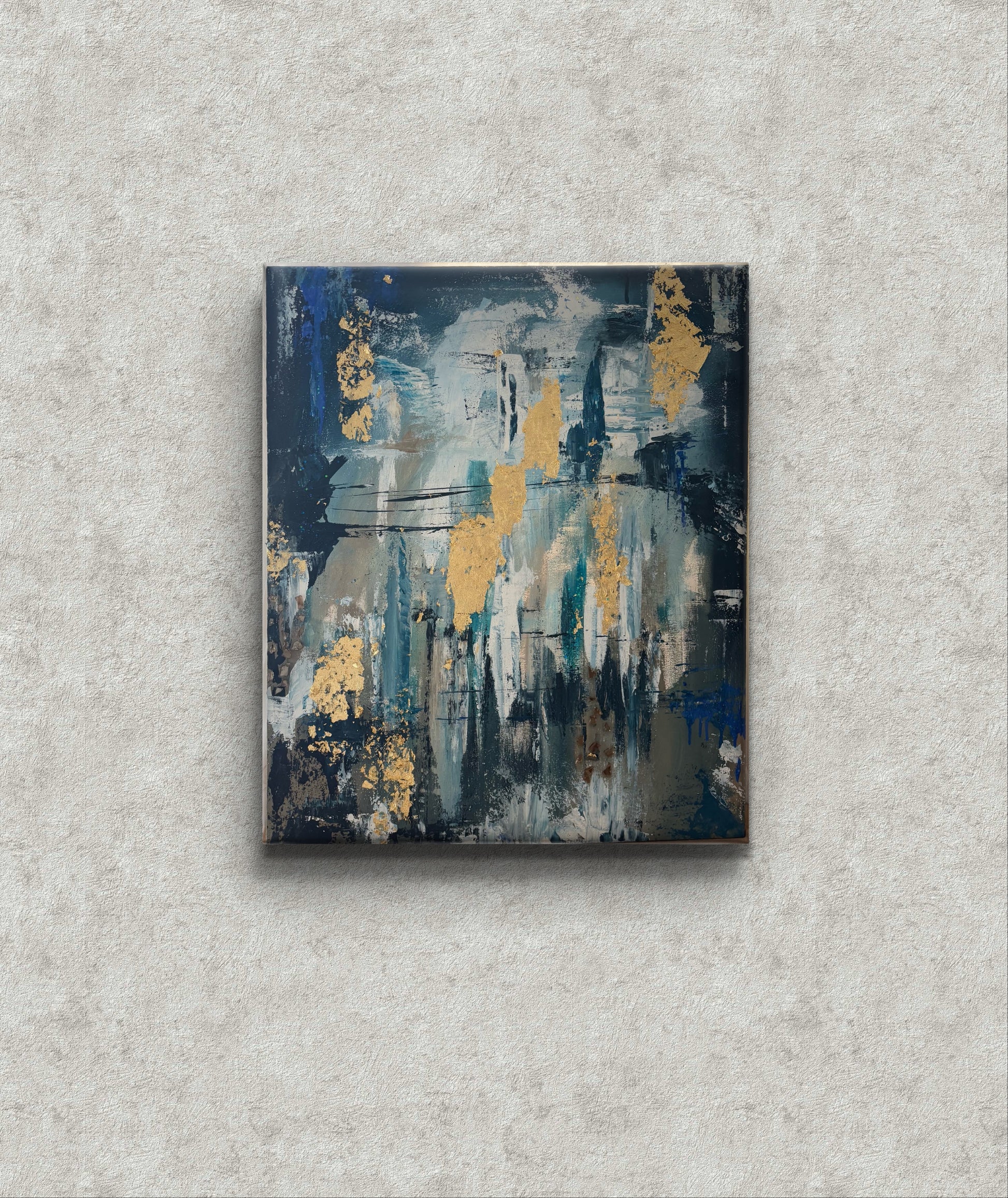 اكتشفوا روعة التعبير الفني المعاصر من خلال هذه المجموعة الفريدة المكوّنة من لوحتين متكاملتين، صُمّمتا ليكونتا معاً قطعة محورية في أي مساحة راقية. تجمع هذه الأعمال بين درجات الأزرق، الرمادي، والتركواز بانسجام بصري ساحر، وتتخللها لمسات من ورق الذهب التي تعكس الضوء وتضفي إحساساً بالفخامة والرقي.